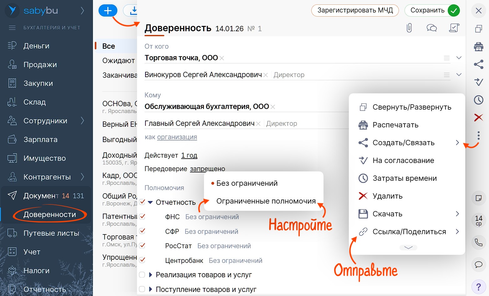 - Перейдите из Saby Buhta в кабинет клиента в один клик и создайте МЧД по инструкции. Полномочия по отчетности проставятся автоматически. Вы можете ограничить их или добавить другие.